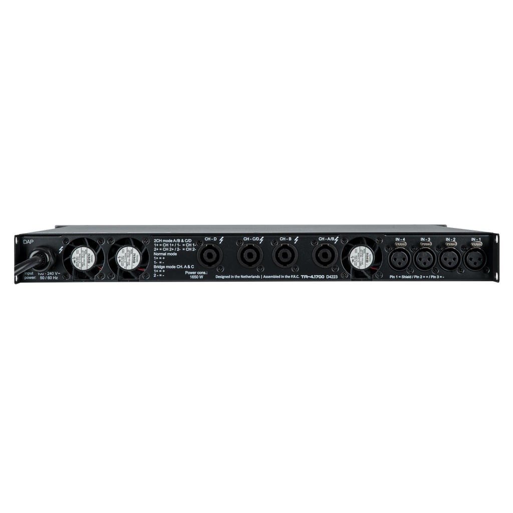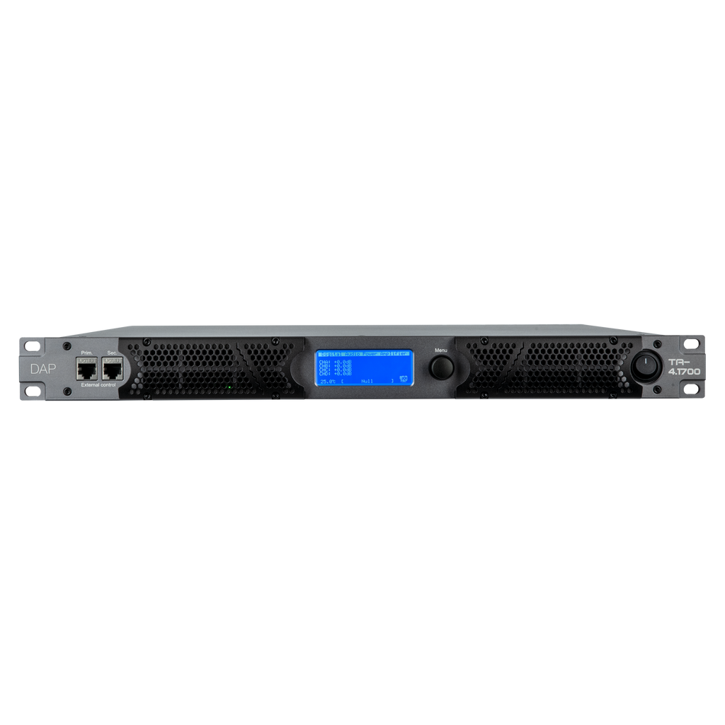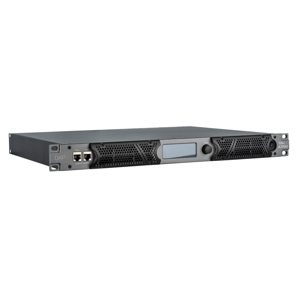 Il DAP TA-4.1700 è un amplificatore di potenza DSP a 4 canali, compatto e leggero, per applicazioni itineranti. In uno spazio rack 1U, eroga 4x 1700 W su 4 ohm, è in grado di pilotare carichi da 2 ohm e può essere utilizzato per sistemi da 70 V e in modalità bridge per una potenza ancora maggiore. Progettato per bassa impedenza e corrente elevata, raggiunge un’efficienza superiore al 90% con un’eccellente stabilità.