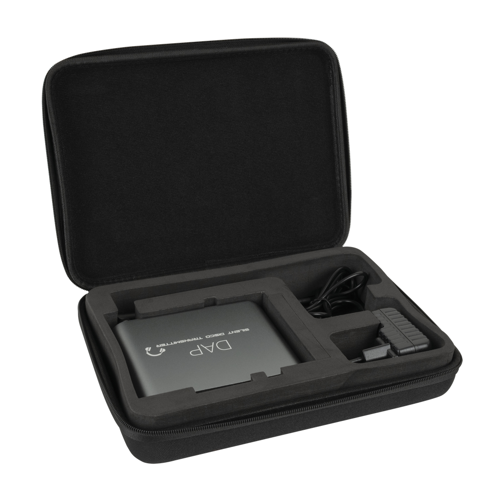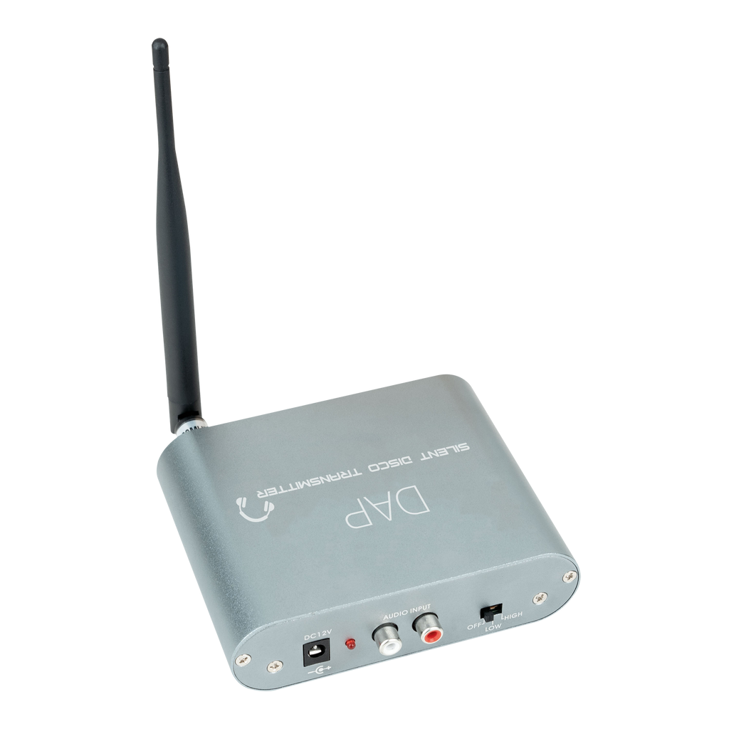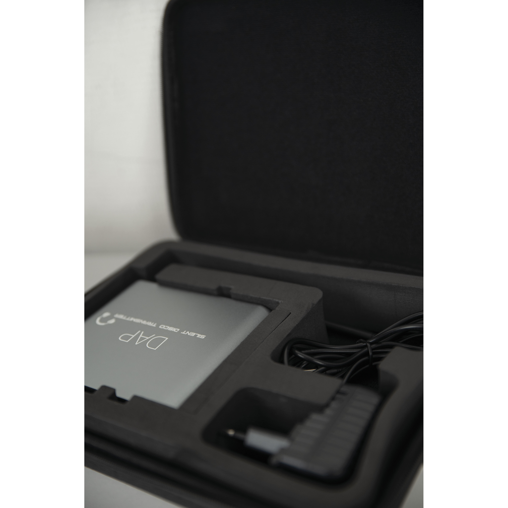 Il trasmettitore DAP Silent Disco è un trasmettitore audio stereo compatto ma potente per configurare una silent disco. Ha una gamma di fino a 450 metri all’aria aperta e supporta 3 canali nella gamma 863-865 MHz. Un display sulla parte anteriore mostra il canale selezionato. È destinato all’uso con le cuffie DAP Silent Disco. Con la tastiera DAP disponibile per il controllo LED delle cuffie Silent Disco collegate al trasmettitore, è possibile controllare in remoto il colore delle luci sulle cuffie Silent Disco. Il segnale audio entra nel trasmettitore attraverso l’ingresso RCA stereo. È dotato di un robusto alloggiamento in alluminio ed è alimentato tramite alimentatore da 12 V DC (incluso). Una custodia morbida è inclusa.