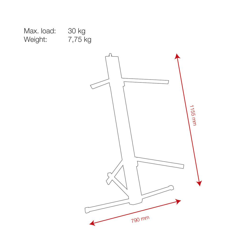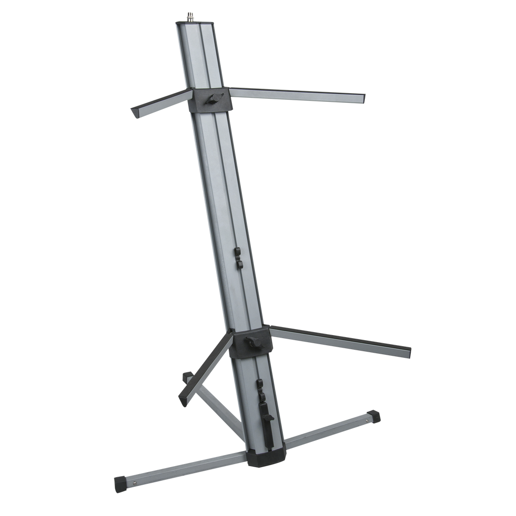 Questo supporto per tastiera è compatto da trasportare, facile da configurare e ha un aspetto alla moda, diversamente dai normali supporti. Può sorreggere 2 tastiere ad altezze regolabili. I piedini si trovano all'interno della colonna, e anche i bracci a tripla barra possono essere piegati nella colonna. In cima alla colonna c'è un adattatore microfonico che può essere usato per montare un collo d'oca.